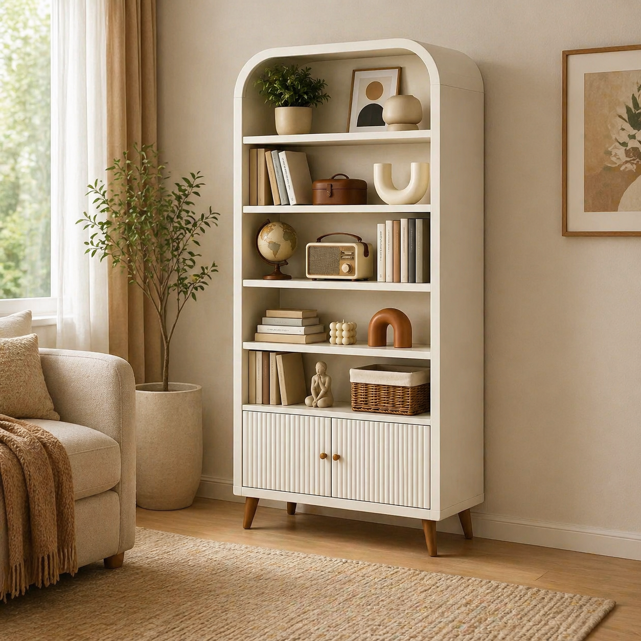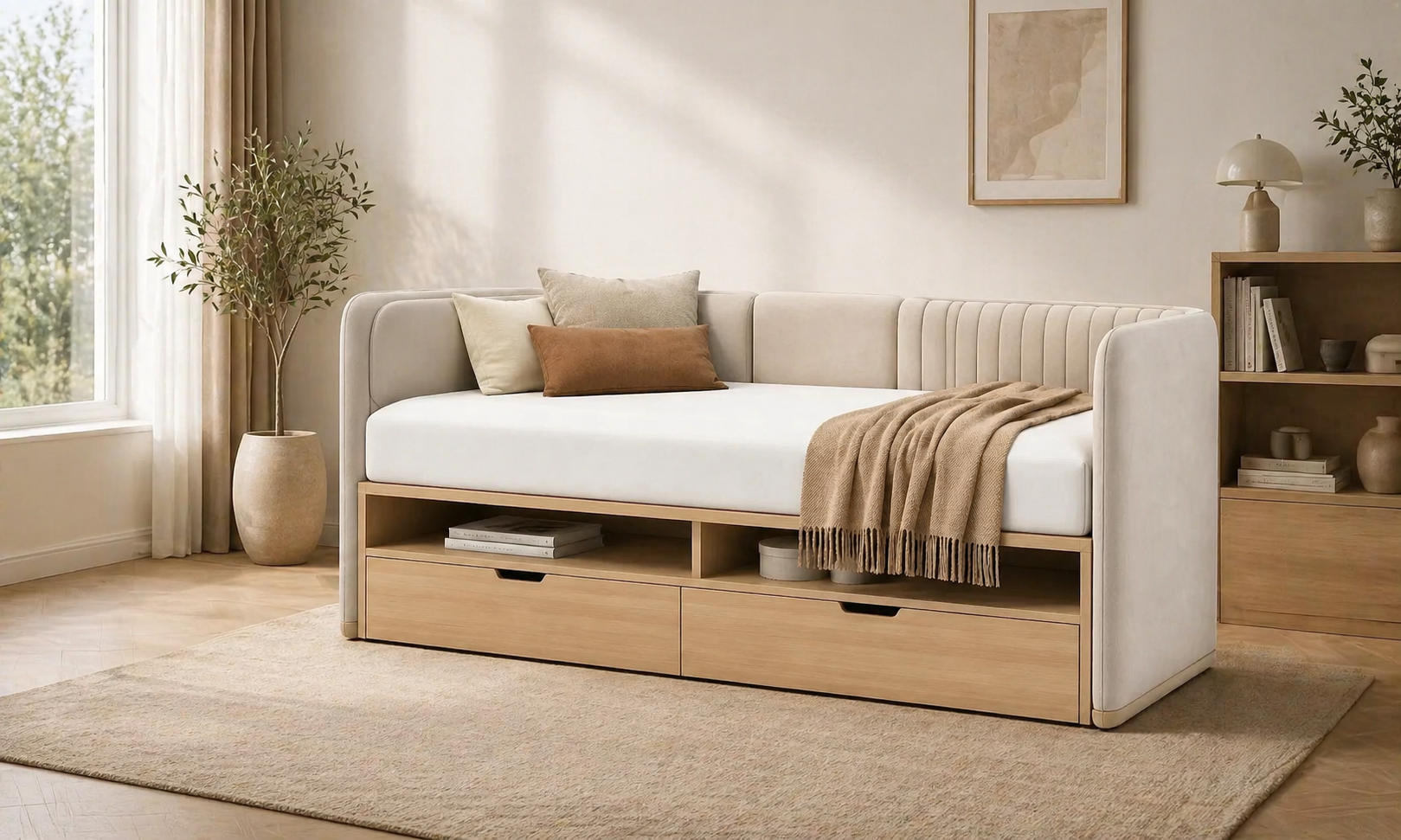 Multifunktionales Sofa mit integrierten Schubladen und offenen Faechern. Bietet Schlafplatz und Stauraum in einem. Robuste Konstruktion fuer taegliche Nutzung. Geeignet fuer Wohn und Gaestezimmer.